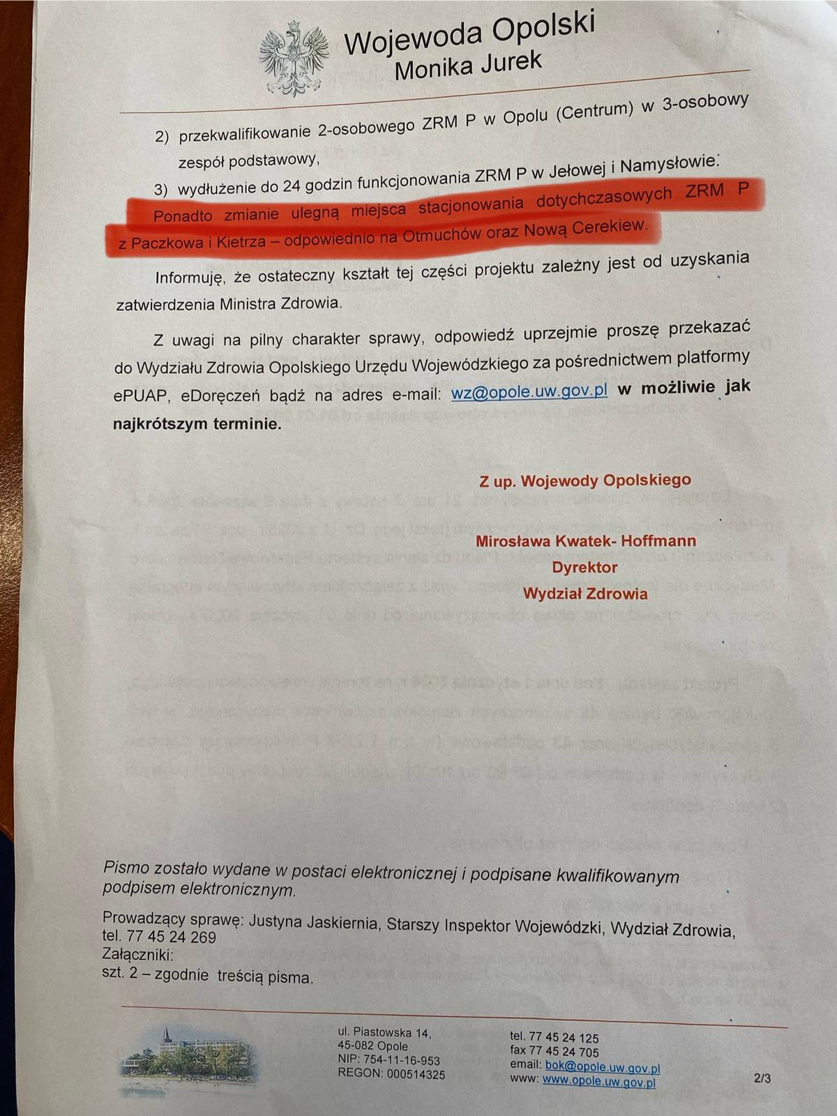 Jestem oburzony decyzją Wojewody Opolskiej Moniki Jurek (PO) o odebraniu karetki z Zespołem Ratownictwa Medycznego mieszkańcom PACZKOWA. W sytuacji zagrożenia życia każda minuta reakcji jest cenna, a minimalizowanie czasu dojazdu pogotowia jest na wagę życia. Tym bardziej, że opinia dyrektora nyskiego szpitala była NEGATYWNA. Zamiast pozyskać dla Województwa Opolskiego kolejną karetkę, koalicja rządząca idzie na łatwiznę, igrając z ludzkim życiem.