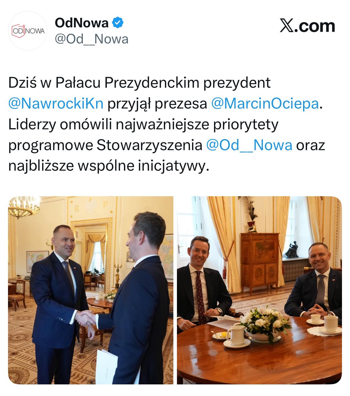Bardzo dziękuję Panu Prezydentowi Karol Nawrocki za zaproszenie do Pałacu Prezydenckiego i świetną rozmowę na temat polityki zagranicznej, obronnej, gospodarczej oraz przyszłości samorządu terytorialnego RP.